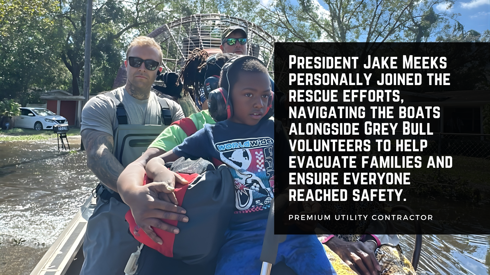 As floodwaters submerged neighborhoods and overwhelmed local resources, Grey Bull identified the most urgent needs and deployed airboats to reach residents stranded in their homes. Premium Utility Contractor jumped in to assist. President Jake Meeks personally joined the rescue efforts, navigating the boats alongside Grey Bull volunteers to help evacuate families and ensure everyone reached safety.