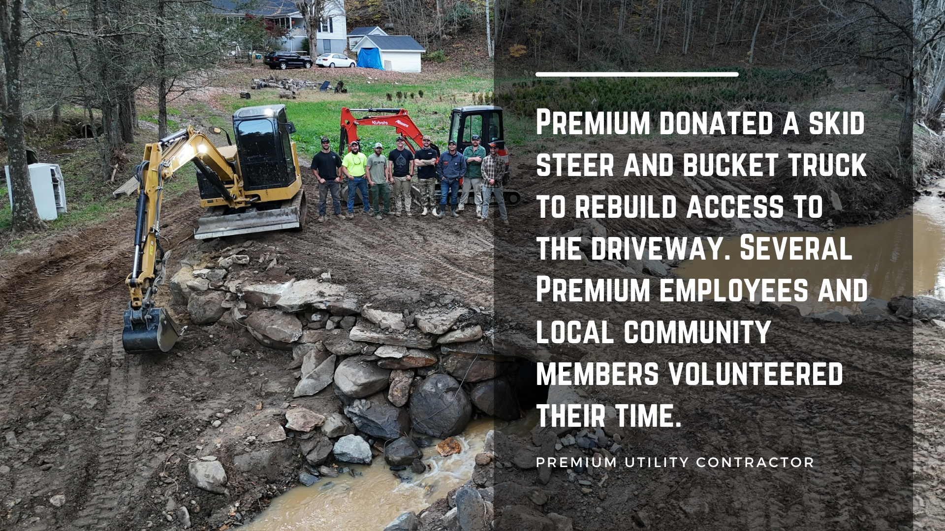 Premium donated a skid steer and bucket truck to rebuild access to the driveway. Several Premium employees and local community members volunteered their time.